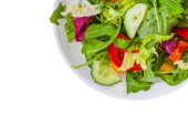 zdrowa sałatka (pomidor, ogórek, mieszanka pozostawia inne składniki) górna koncepcja menu. tło żywności. skopiować kosmiczny keto lub dieta paleo