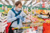 Chory człowiek z gorączką opierający się na koszyku pełnym jedzenia z tarczami na twarzy i rękawiczkami w supermarkecie