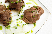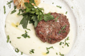 stek wołowy pokrojony na kawałki z warzywami na białym talerzu zdjęcie, izolat, czarne tło