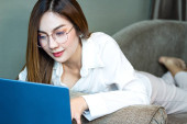 Zdjęcie "Urocza młoda kobieta korzystająca z laptopa w domu" może być wykorzystywane do celów osobistych i komercyjnych zgodnie z warunkami zakupionej licencji Royalty-free. Obraz jest dostępny do pobrania w jakości wysokiej rozdzielczości do 5760x3840.