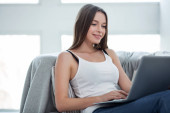 Urocza młoda kobieta korzystająca z laptopa w domu