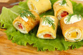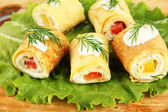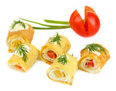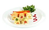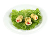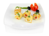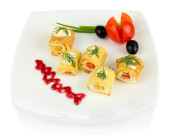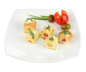bułki jajko krem sera i papryki, na talerzu, na białym tle
