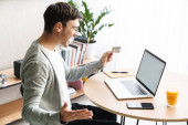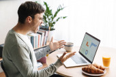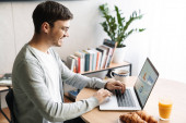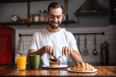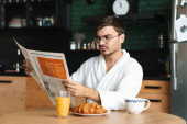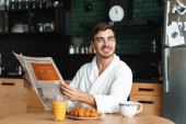 Uśmiechnięty młodzieniec w szlafroku jedzący śniadanie, siedzący rano w kuchni i czytający gazety.