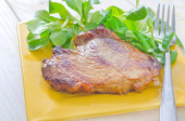 Pieczone ramie wieprzowe na kości z przyprawami, ziołami i olejkiem aromatycznym. Skupienie selektywne.