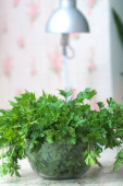 Kawałek świeżego koperku i pietruszki na szklanym kubku z wodą na desce do krojenia na białym tle. Przyprawy warzywne na stole. Zdrowe wegetariańskie jedzenie.