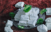 Pianka domowej roboty Square z miętą na szklanej misce na fioletowym tle. Płaskie jedzenie. Jedzenie na fioletowym tle. Domowej roboty słodycze. Kupa pianki cukrowej.