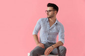 sexy biznesmen noszenie okulary siedzi z jedną nogą spoczywa na sześcian i patrząc na bok cool na różowym tle studio