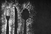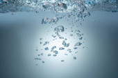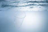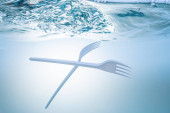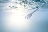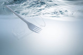 Globalny problem środowiskowy, zanieczyszczenie środowiska, odpady w morzach i rzekach. Plastikowe kubki i widelce, pod wodą.