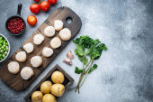 Zdjęcie "Mini kule sera mozzarella, świeże pomidory wiśniowe, liść bazylii, ser do sałatki caprese na czarnej tablicy z kamienia łupkowego z pionowym miejscem na tekst. Widok z góry" może być wykorzystywane do celów osobistych i komercyjnych zgodnie z warunkami zakupionej licencji Royalty-free. Obraz jest dostępny do pobrania w jakości wysokiej rozdzielczości do 5760x3840.