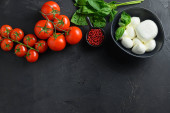 Mini kule sera mozzarella, świeże pomidory wiśniowe, liść bazylii, ser do sałatki caprese na czarnej tablicy z kamienia łupkowego z pionowym miejscem na tekst. Widok z góry