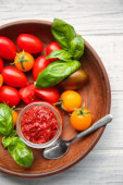świeży ketchup z gałązką zielonej bazylii, plasterki pomidorów, cebula, czerwona papryka chili na drewnianym tle, sos warzywny