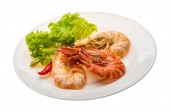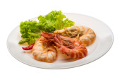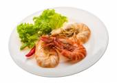 Krewetki Stir smażone z plasterkami chili i soli Thai żywności Fuzja ozdobić rzeźbione pomidory i żółty warzywa chili, liść czerwony dąb widok z boku izolowane na białym tle