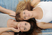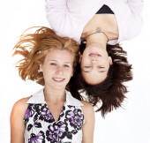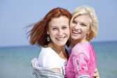 portret dwóch dziewczynek w pobliżu schodów drewnianych na plaży.