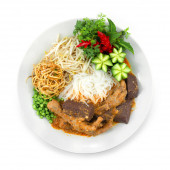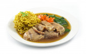 Cienki makaron ryżowy z wieprzowiną, jarmuż Chińskie warzywa w sosie sojowym sos sojowy zupa chiński styl ozdobić rzeźbione marchewki popularne jedzenie w ulicznej żywności Tajlandii widok z boku
