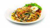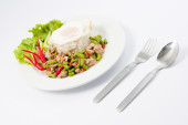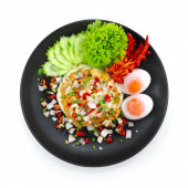 Macki kałamarnicy Mieszać smażony czosnek i pieprz z ryżem i smażone jajko ozdobić rzeźbione chili fusion Tajskie jedzenie pikantne danie widok z góry