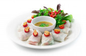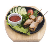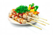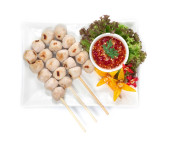 Piłka wieprzowa Grillowana z bambusowymi pałeczkami wewnątrz naczynia z owocami morza pikantny sos do zanurzania ozdobić papryką chili Tajskie jedzenie przystawka pikantny tajski styl stronie widok