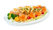 Zdjęcie "Piłka wieprzowa Grillowana z bambusowymi pałeczkami serwującymi na górze z owocami morza pikantny sos do zanurzania i kolendry warzywa tajskie jedzenie przystawka pikantny tajski styl widok z boku" może być wykorzystywane do celów osobistych i komercyjnych zgodnie z warunkami zakupionej licencji Royalty-free. Obraz jest dostępny do pobrania w jakości wysokiej rozdzielczości do 5760x3840.
