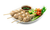 Piłka wieprzowa Grillowana z bambusowymi pałeczkami serwującymi na górze z owocami morza pikantny sos do zanurzania i kolendry warzywa tajskie jedzenie przystawka pikantny tajski styl widok z boku