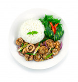 Zdjęcie "Tajskie jedzenie Stir-smażone Kurczak pikantny i tajski bazylia serwowane z ryżem i smażone jajko ozdobić zielony papryka żółte chili i marchew rzeźbione biały płytka widok z góry izolowane na białym tle" może być wykorzystywane do celów osobistych i komercyjnych zgodnie z warunkami zakupionej licencji Royalty-free. Obraz jest dostępny do pobrania w jakości wysokiej rozdzielczości do 5760x3840.