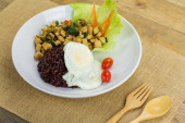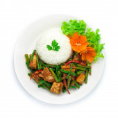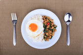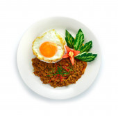 Tajskie jedzenie Stir-smażone Kurczak pikantny i tajski bazylia serwowane z ryżem i smażone jajko ozdobić zielony papryka żółte chili i marchew rzeźbione biały płytka widok z góry izolowane na białym tle