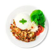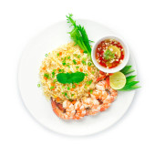 Fried Rice with Crab and Eggs Thai Jedzenie i azjatyckie Jedzenie fuzja styl ozdobić warzywa rzeźbione pomidory, Wiosna cebula widok z góry