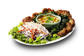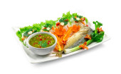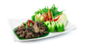 Vietnamese Food Fried Pork Wrapped in Wild Betal Leaf Served Sweet Sauce mix Peanut chopped Fusion Food wietnamski styl ozdobić plasterkami kapusty i rzeźbione chili widok z boku