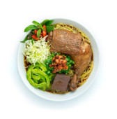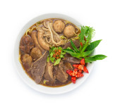 Spicy Soup Offal and Pork Salad with ingredient Spicy Herbs Curry pasta Northern Style Thai Food Popularne na północy kotlet kolendry Thai zioła widok z góry