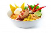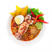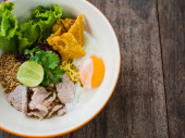 Thai Tom Yum Sukhothai Makaron styl bez zupy (Drobno krojony biały makaron ryżowy Suszona zupa) Czerwony pieczony, Cukier kokosowy, Chrupiąca wieprzowina, Fasola, Chili, Wapno, Śmierdzące zioło, Czosnek, mielona wieprzowina, Wieprzowina Ball, Orzeszek ziemny i chrupiące Wonton bowl