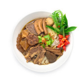 Makaron ryżowy Gorzka dynia Brązowa Zupa Podawana Duszona Duszona Duszona Drum Kurczak, Krwawy Kurczak Podawany Gorzka Gurda Plasterek, Chili i Warzywa na szczycie Chrupiący Czosnek widok z boku
