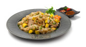 Thai Sukiyaki Stir Fried with Fish, eggs and Vegetables Carved Carrots flowers shape served Sauce, chili and czosnek Asian Food fusion Style Popular Street Food Goodtasty Zdrowa dieta hot dish sideview