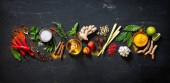Kolorowe tło różnych ziół i przypraw w misach do gotowania z przestrzenią do kopiowania tekstu