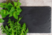Zielone warzywa, zdrowe, wegetariańskie jedzenie. Pietruszka, bazylia, ogórek, brokuły, zielona papryka, cukinia, kiełki fasoli, szpinak. Top view ciężka rama surowego jedzenia, warzywa liściaste na ciemnym tle