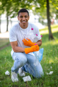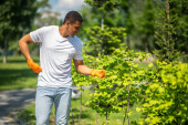 Zachwycony ciemnowłosy mężczyzna w rękawiczkach ochronnych kucący, podlewający spatifilium z konewką, uśmiechnięty
