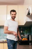 szczęśliwy człowiek trzyma szmaty i butelki spray podczas sprzątania mieszkania
