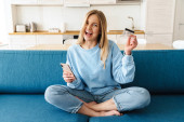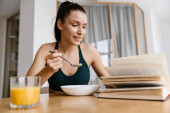 Zdjęcie "Obraz wesołej młodej kobiety z blond włosów czytając magazyn podczas śniadania w nowoczesnej kuchni" może być wykorzystywane do celów osobistych i komercyjnych zgodnie z warunkami zakupionej licencji Royalty-free. Obraz jest dostępny do pobrania w jakości wysokiej rozdzielczości do 5760x3840.