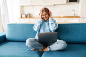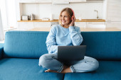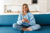 Obraz wesołej młodej kobiety z blond włosów czytając magazyn podczas śniadania w nowoczesnej kuchni