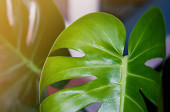 Koncentrując się na liściach roślin, tekstura zielonych liści, liść w doniczce na tarasie, Ogród w budynku i Zielona ściana. Zielone abstrakcyjne tło.