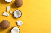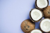 widok z góry świeże smaczne połówki kokosowe z pękniętej skorupy i płatki na białym tle