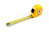 Żółta taśma pomiarowa na białym tle z Drop Down Shadow, Side View. Przestrzeń COPY.