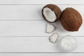 widok z góry świeże smaczne pęknięte kokosy z płatków i muszli na białym tle