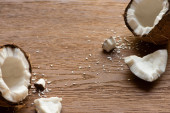 widok z góry świeże smaczne pęknięty kokos z płatków na drewnianym stole