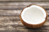 świeże smaczne kokosy pół w pobliżu płatków na drewnianym stole