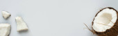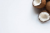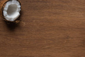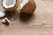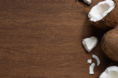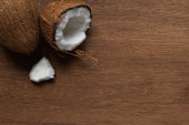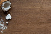 widok z góry świeże smaczne orzechy kokosowe pół w pobliżu płatków na drewnianym stole