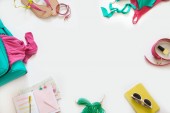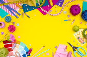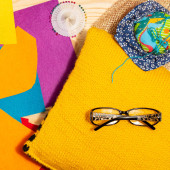 Zestaw kolorowych tkanin żółto-zielonych, nożyczek, guzików, szpul nici i okularów na żółto. Koncepcja krawiectwa, mozaiki i robótki ręcznej. Igły i szycie.