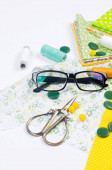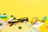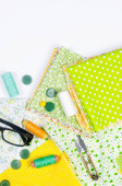 Zestaw kolorowych tkanin żółto-zielonych, nożyczki, guziki, szpule nici i okulary na białym. Koncepcja krawiectwa, mozaiki i robótki ręcznej. Igły i szycie.