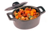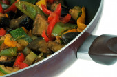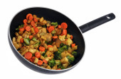 Warzywa gotowane na patelni z bliska na białym tle