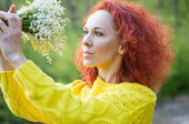 zbliżenie czerwony włosy dość gwiaździste oczy dziewczyna z bukietem białe kwiaty