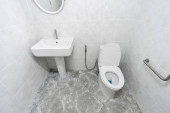 Zdjęcie białej zamkniętej toalety w toalecie ze ścianami ceramicznymi