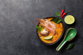 Zdjęcie "Tom Yum tradycyjnej tajskiej zupy z owoców morza, grzyby, mleko kokosowe i gorące przyprawy. Widok z góry z miejsca kopiowania" może być wykorzystywane do celów osobistych i komercyjnych zgodnie z warunkami zakupionej licencji Royalty-free. Obraz jest dostępny do pobrania w jakości wysokiej rozdzielczości do 5760x3840.