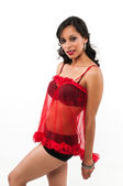 młoda kobieta uśmiechający się w czerwony gorset i czarne majtki